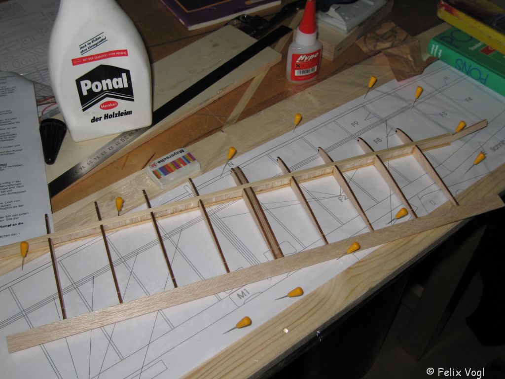 Das Bild zeigt den linken Außenflügel mit angeklebter Endleiste. Das Konstrukt aus Rippen und Holm wird mit Nadeln fixiert;