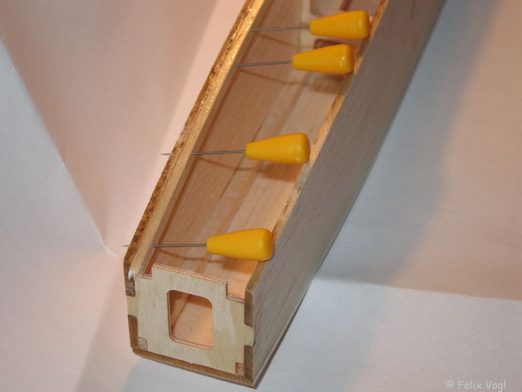 Auch den oberen Kiefernholm hab ich verklebt; dabei habe ich diesmal mit Ponal Holzleim geklebt, um einen gewissen, zeitlichen Spielraum zu haben.