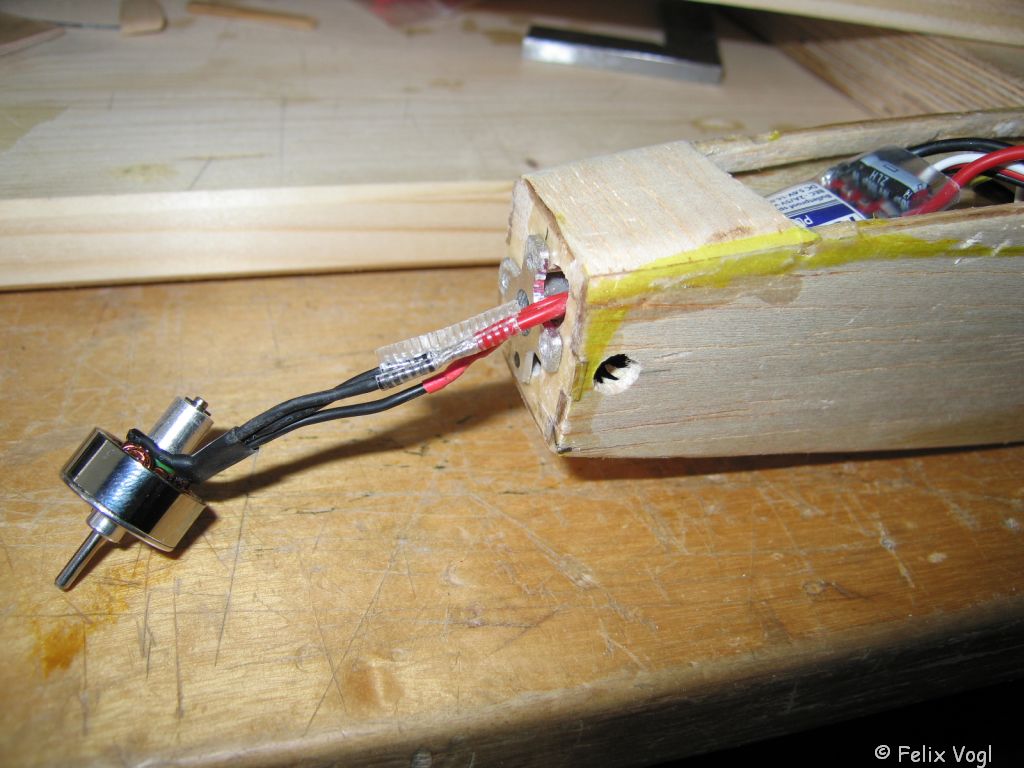 Durch die Ausfräsung vorne am Motorspant kann ich den Regler nach vorne aus dem Rumpf ziehen - noch während er am Motor angelötet ist. Das erspart beim Motorwechsel oder auch beim Einbau eine Menge Arbeit. Und die Laufrichtung vom Motor bleibt auch immer gleich (wäre das Loch nicht da, müsste man ja immer den Regler vom Motor ablöten).